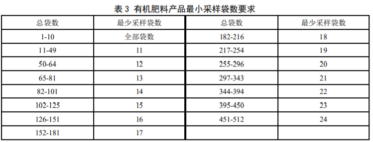 采取随机抽样的方法,有机肥料产品总袋数与最少采样袋数见表3。将抽出的样品袋平放,每袋从最长对角线插入取样器,从包装物的表面、中间和底部三个水平取样,每袋取出不少于200g样品,每批产品采取的样品总量不少于4000g。或拆包用取样铲或勺取样。总袋数超过512袋时,最少采样袋数按公式(1)计算: