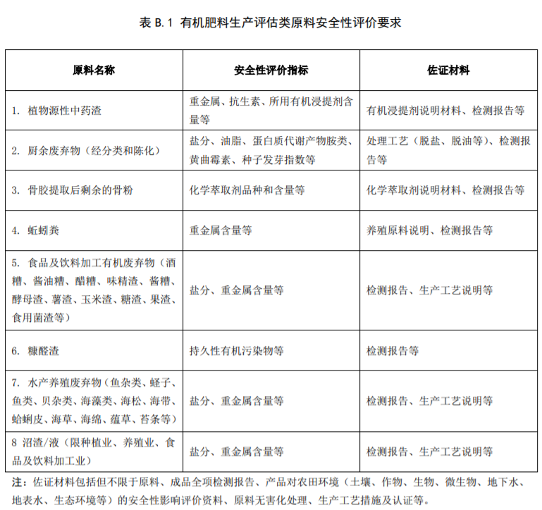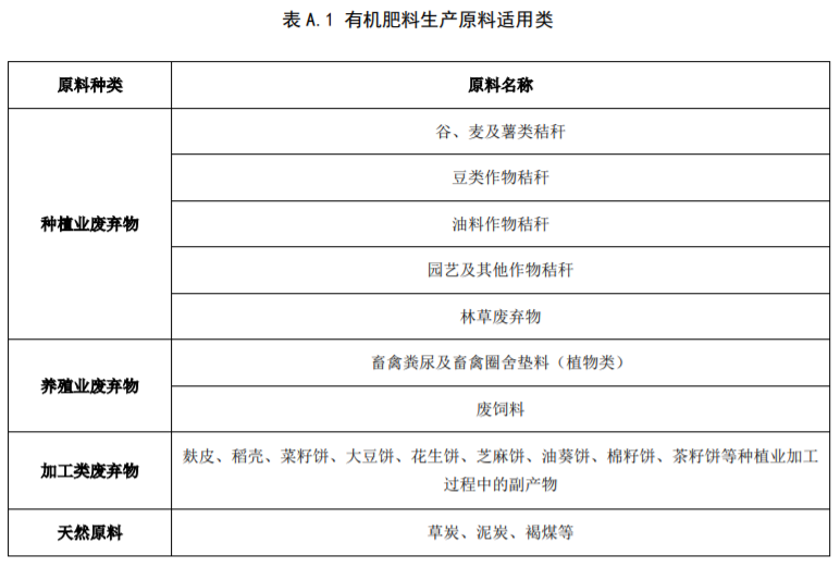 有机肥料生产原料应遵循“安全、卫生、稳定、有效”的基本原则,原料按目录分类管理,分为适用类、评估类和禁用类。优先选用附录A中的适用类原料;禁止选用粉煤灰、钢渣、污泥、生活垃圾(经分类陈化后的厨余废弃物除外)、含有外来入侵物种物料和法律法规禁止的物料等存在安全隐患的禁用类原料;其余为评估类原料。如选择附录B中的评估类原料,须进行安全评估并通过安全性评价后才能用于有机肥料生产。