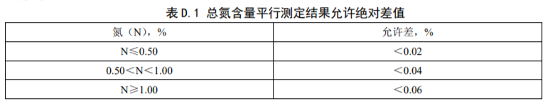 取两个平行测定结果的算术平均值为测定结果。两个平行测定结果允许绝对差应符合表 D.1的要求。