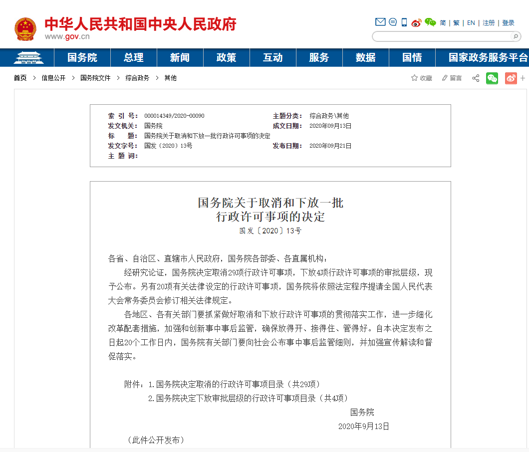 经研究论证,国务院决定取消29项行政许可事项,下放4项行政许可事项的审批层级,现予公布。另有20项有关法律设定的行政许可事项,国务院将依照法定程序提请全国人民代表大会常务委员会修订相关法律规定。